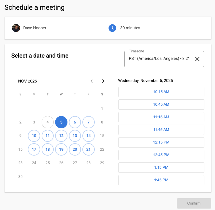 One thing to note: Our meeting link is tied to our calendar. Meeting times are displayed based on our actual availability. This means we don't have to exchange texts or emails asking "when is a good time". You can just visit the page, choose a day and a time that you see listed on our page that works with you. It's all done automatically and we are simply notified that you've set up a meeting with us.